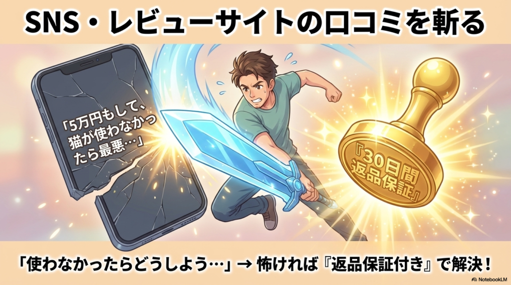 CATLINK、PetSnowy、Neakasa M1は30〜60日間の返品保証がある。じっくり試してダメなら返品できる。5万円の心理的ハードルが全然変わるだろ。