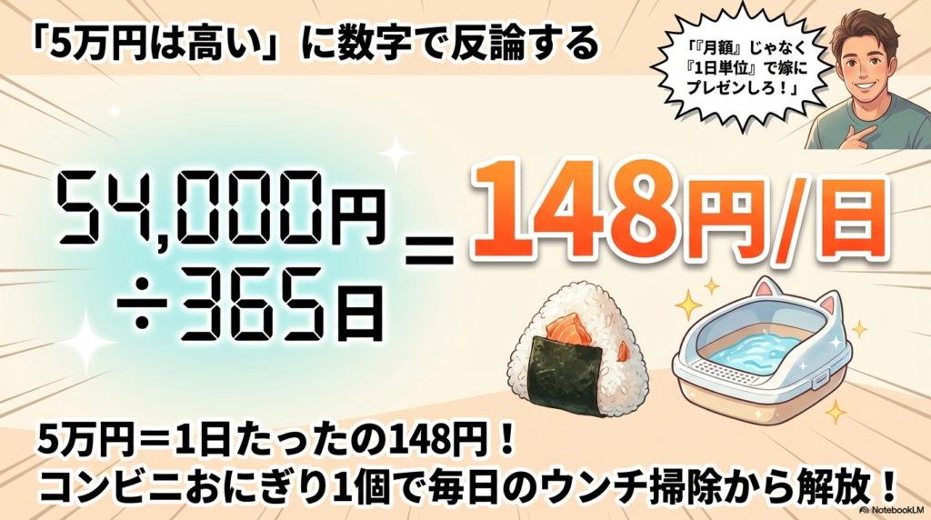 嫁への購入プレゼンは「1日あたり〇〇円」換算が最強だ。月額だと高く見えるが、1日単位にすると「それなら…」となる