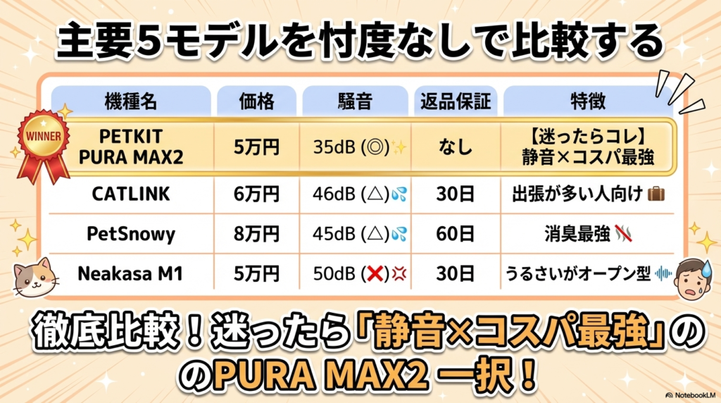 カタログと実測のギャップ、猫が使わない問題の解決法、主要5モデルの忖度なし比較まで全部さらけ出す。