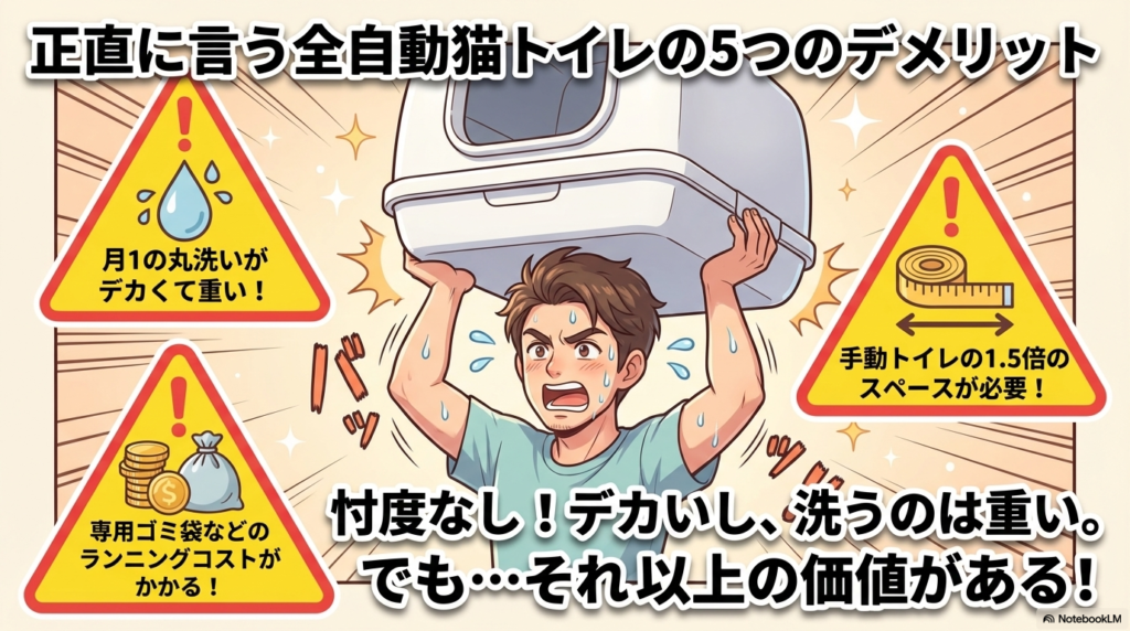 ③ランニングコストがかかる猫砂+ゴミ袋+フィルター+電気代で月1,800〜2,700円(手動との差額は月500〜1,000円)1日あたり17〜33円の差。汎用品OKの機種を選べばコストは抑えられる