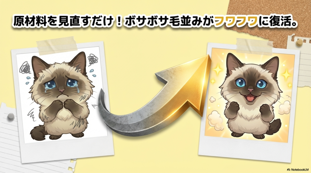 切り替えから3週間。ルナの毛並みが明らかに変わった。パサついていたラグドール風の長毛に、ふわっとしたツヤが戻ってきたんだ。吐き戻しの回数も、月に5〜6回あったのが1回以下に。