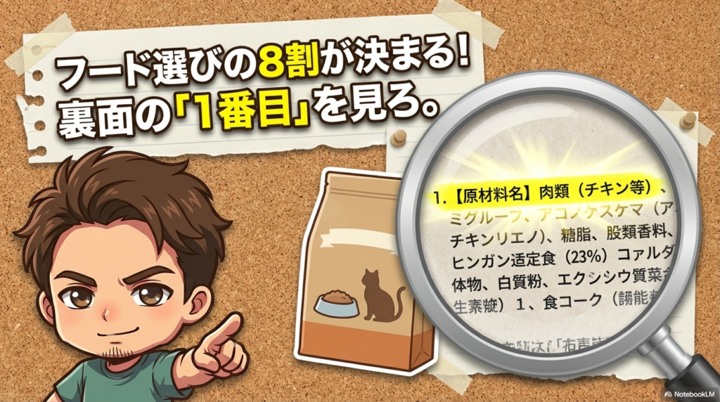 フード選びの8割は、原材料表示の「1番目」を確認するだけで決まるということ。