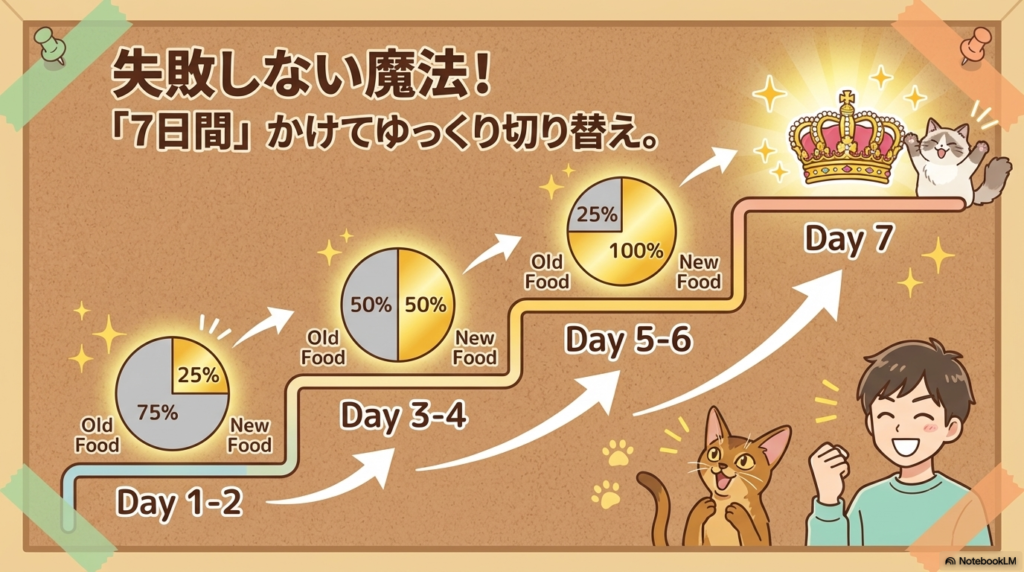 レオ、だから犬は雑って言われるニャン…猫の消化器はデリケートなの。7日間かけて段階的に変えるのが常識ニャン!
