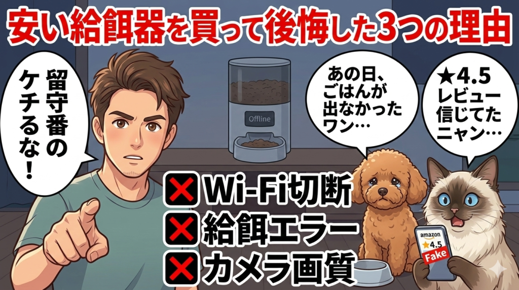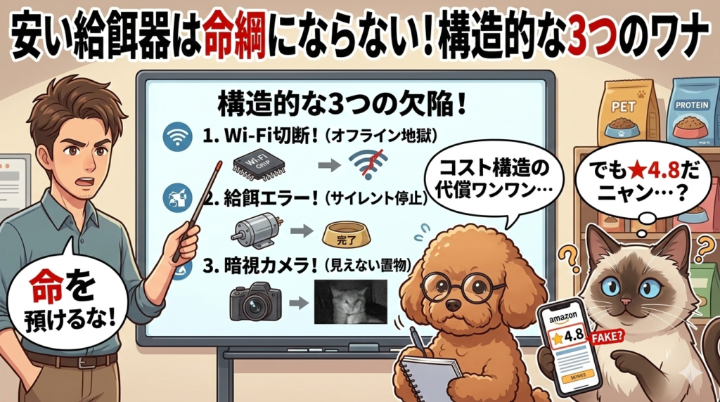 要点1:安いペットカメラ付き給餌器には「Wi-Fi切断」「サイレントエラー」「低画質カメラ」の3大リスクがある。