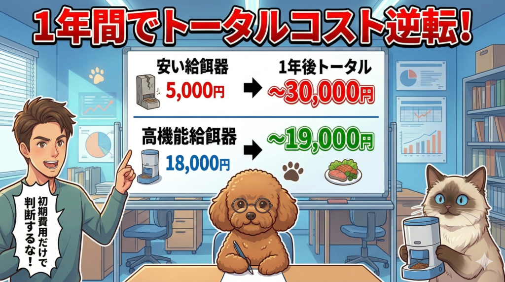 「高い給餌器を買う余裕がない」という気持ち、よく分かる。僕もそうだった。でも、1年間のトータルコストで比較すると、安物の方が高くつくケースが多いんだ。