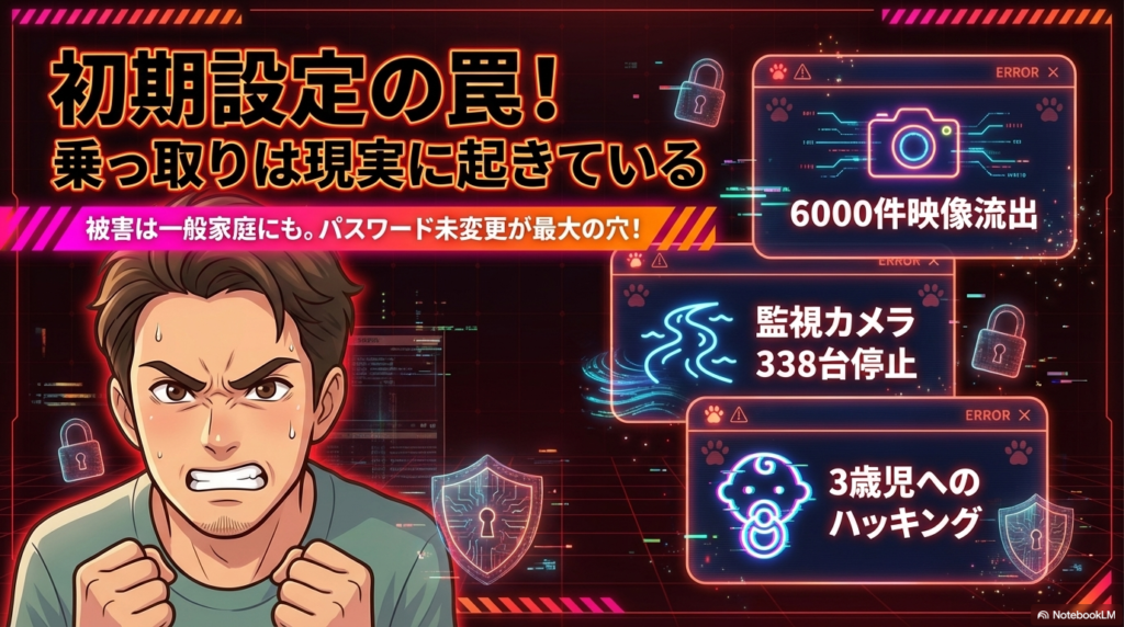 怖い話をしたいわけじゃない。でも現実を知らないと対策も立てられない。「まさか自分のカメラが」と思っているうちは、対策のスタートラインにすら立てていない。まずは実際に起きたハッキング事件を3つだけ紹介する。どれも「特別な環境」で起きたわけじゃないということを、よく覚えておいてほしい。