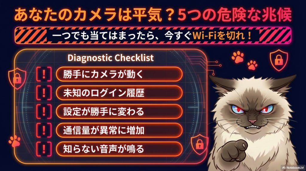 一つでも兆候があったら、まずカメラをWi-Fiから切り離す。LANケーブルを抜く、Wi-Fiの接続を解除する。それから落ち着いて対策を打てばいい。パニックで電源を切るだけだと、不正アクセスの痕跡が消える可能性があるから注意してくれ。