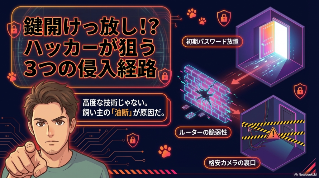 でも白状すると、自宅のWi-Fiルーターのパスワードは3年間初期設定のまま。5,000円の中華製自動給餌器がオフラインになってレオが嘔吐した「給餌器オフライン事件」を経験したのに、IoT機器のセキュリティには完全に無頓着だった。
