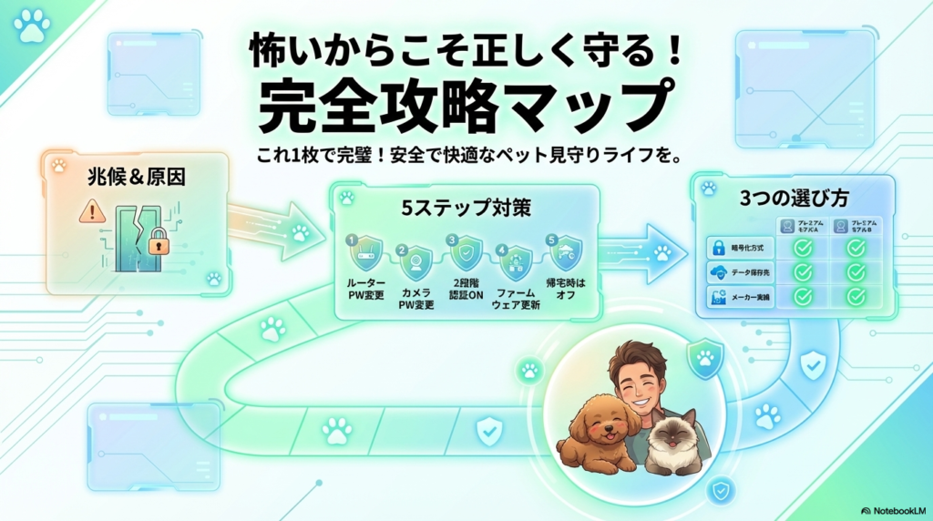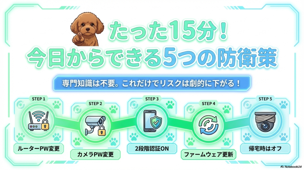 ここまで怖い話ばかりしてきたけど、ここからが本番だ。以下の5つを実行するだけで、ペットカメラのセキュリティは劇的に改善する。