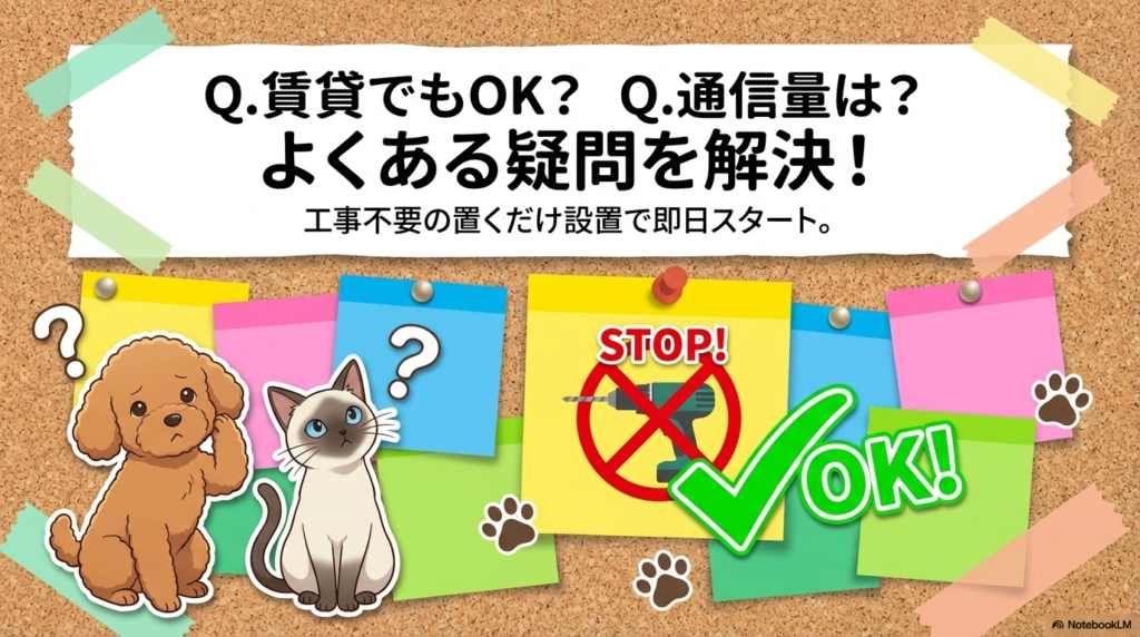 FurboもSwitchBotも、置くだけで設置完了。壁への穴あけや工事は一切不要だ。Wi-Fiとコンセントがあれば、届いたその日から使える。僕も築15年の賃貸マンションで使っている。