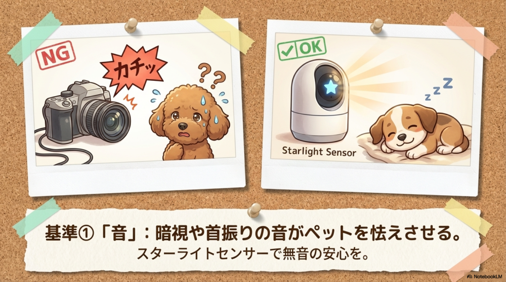 基準①「音」:赤外線切り替え音・首振り音はペットを怯えさせる
