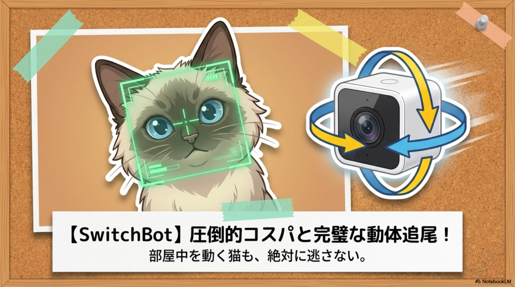 コスパ重視、追尾性能重視、サブスク料金をかけたくない飼い主には、SwitchBotが正解だ。特に猫は部屋の中を自由に動き回るから、追尾性能の高さが活きる場面が多い。