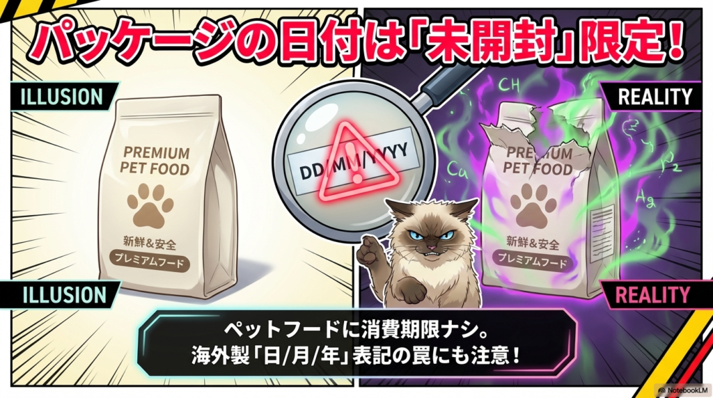 ペットフードには消費期限がない。だからこそ、飼い主が自分で「この日までに使い切る」と線を引く必要がある。パッケージの日付を信じて安心するのは、もうやめよう。