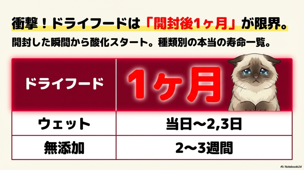 ここが一番大事なパートだ。フードの種類によって、開封後の「本当の寿命」はまったく違う。パッケージの日付じゃなく、開封日からのカウントダウンを基準にしてくれ。