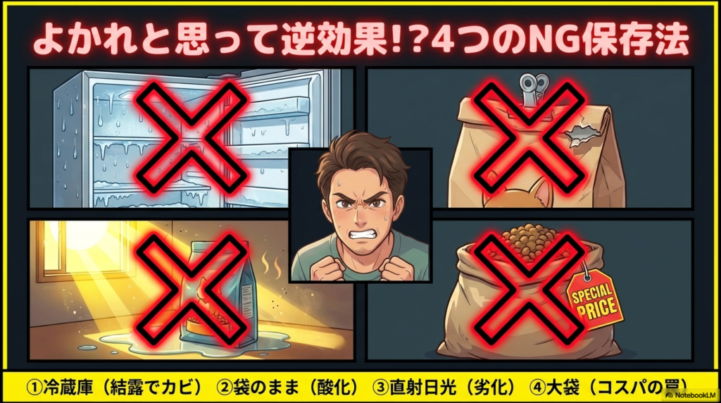ドライフードの保存場所は常温の冷暗所が正解。冷蔵庫に入れていいのはウェットフードの残り(2〜3日以内)だけだと思ってくれ。「冷蔵庫=長持ち」は人間の感覚であって、ドライフードには当てはまらない。