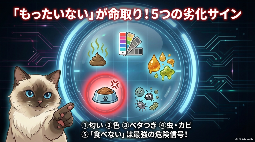- 劣化サイン(匂い・色・触感・虫・ペットの拒否)が出たら即廃棄