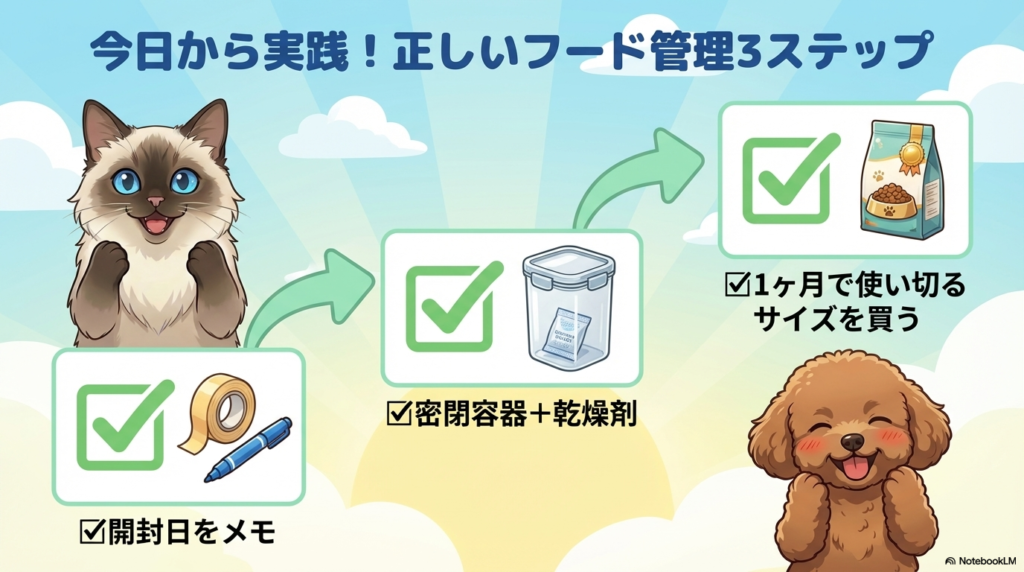 フード選びの段階から「管理しやすいサイズか」「開封後1ヶ月以内に使い切れるか」を基準に入れるのも、一つの方法だ。どんなに品質の良いフードでも、管理を怠れば酸化する。選ぶことと守ることは、セットだと思ってくれ。