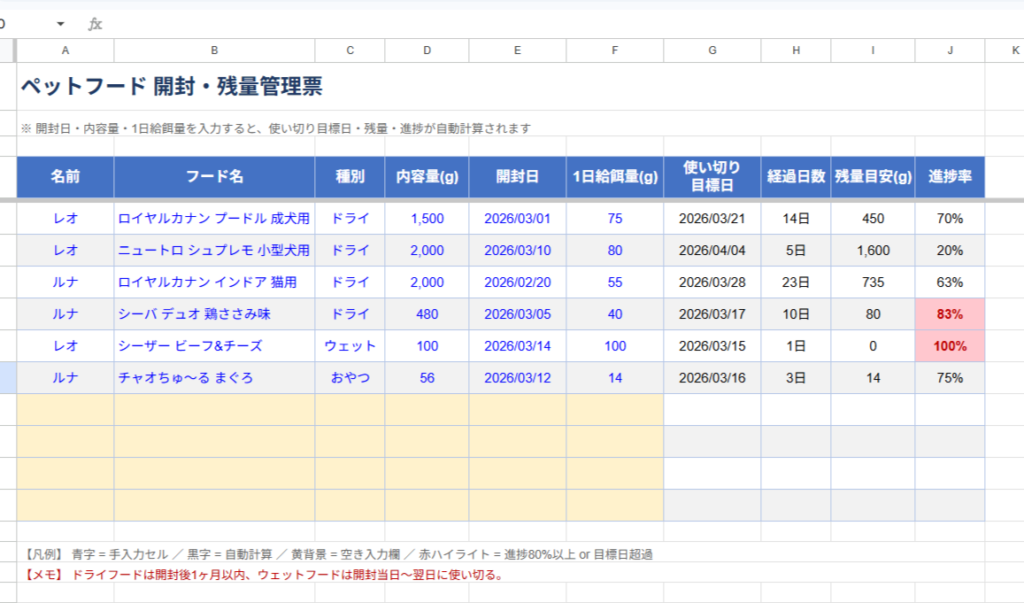 今はスプレッドシートでフードの開封日・残量・使い切り目標日を管理している。PM的すぎるって笑われるかもしれないけど、これがプロジェクトマネージャーの職業病だと思ってくれ。
